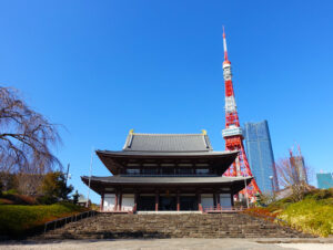 本殿の向こう側にスカイツリーが見える。この対比がとても面白い。
