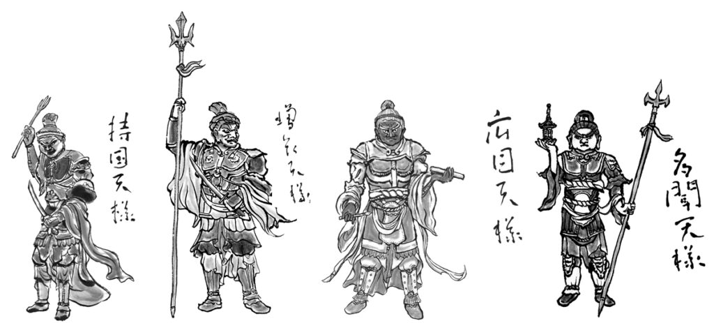 - 東を守る持国天、南を守る増長天、西を守る広目天、北を守る多聞天と担当が決まっている。